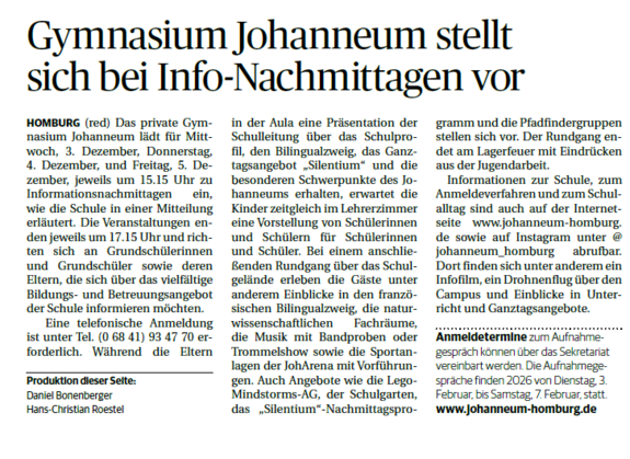 Gymnasium Johanneum stellt sich bei Info-Nachmittagen vor
