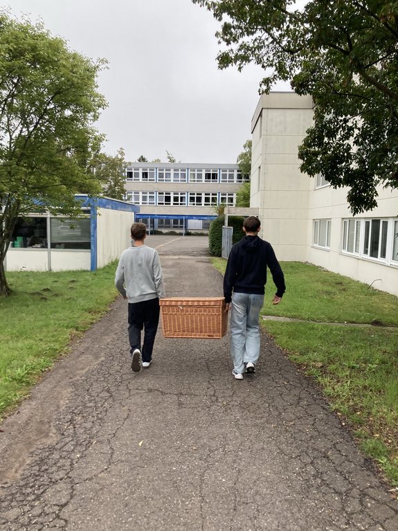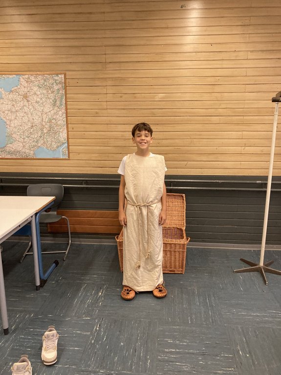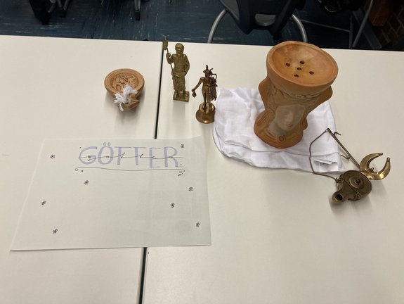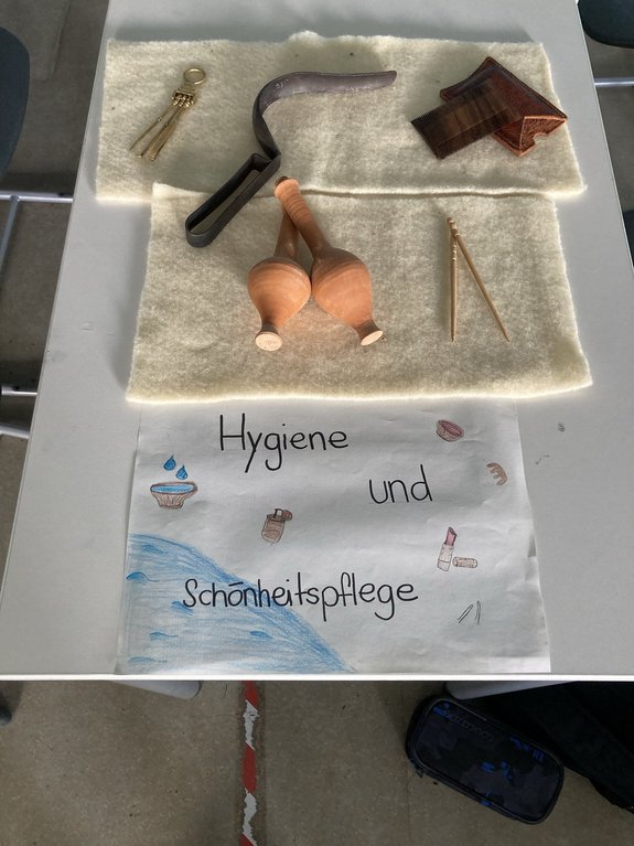 Aus dem Römermuseum Schwarzenacker wurde für den Latein- und Geschichtsunterricht die Römerkiste (*cista Romana*) ausgeliehen und kam bei der 7b und den Lateinern der Klassenstufe 8 zum Einsatz. Realienkunde und Gegenstandsquellen zum Anfassen, wie die fächerübergreifende Bildergalerie zeigt: