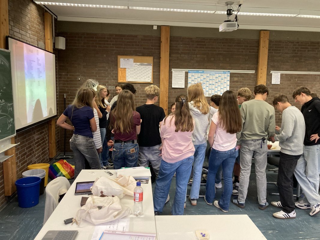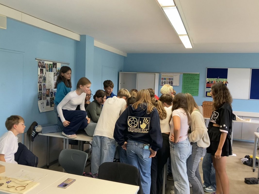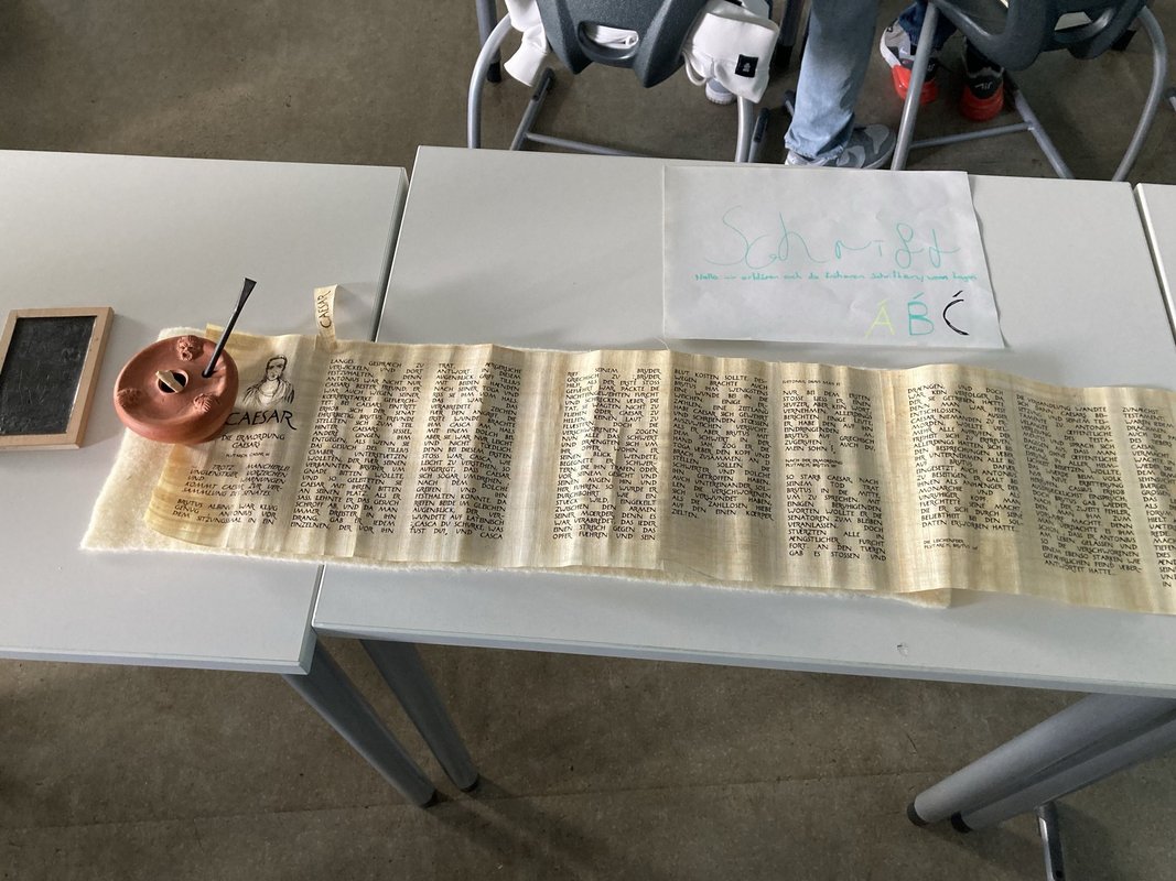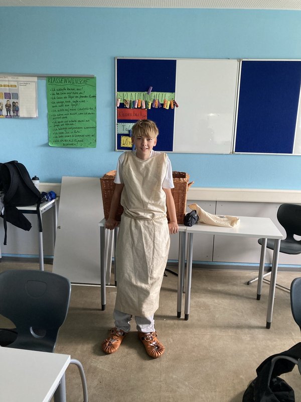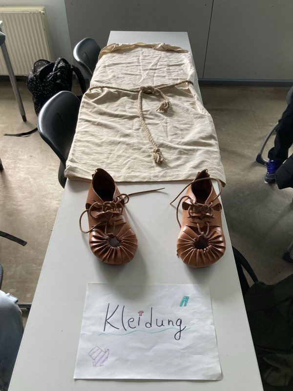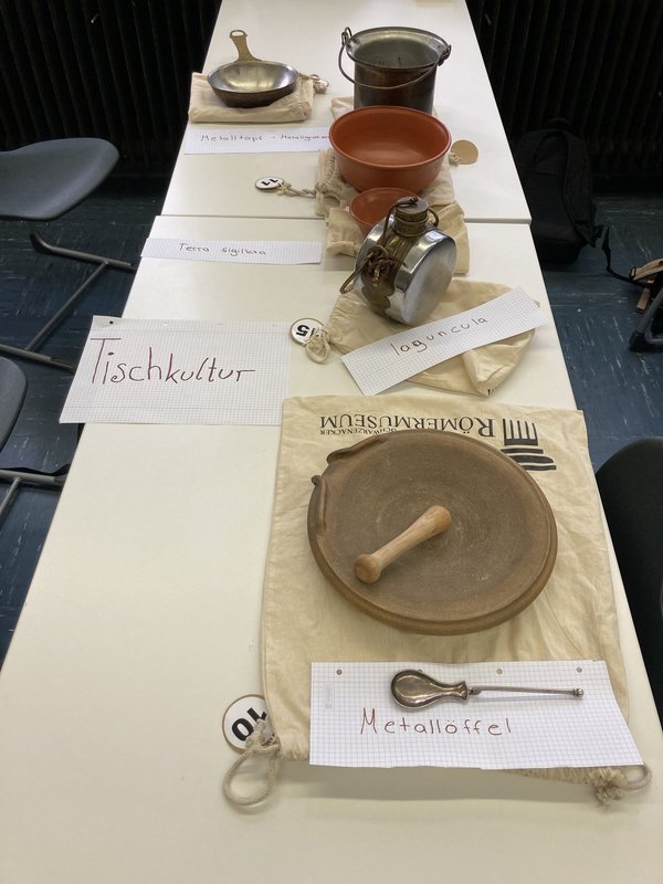 Aus dem Römermuseum Schwarzenacker wurde für den Latein- und Geschichtsunterricht die Römerkiste (*cista Romana*) ausgeliehen und kam bei der 7b und den Lateinern der Klassenstufe 8 zum Einsatz. Realienkunde und Gegenstandsquellen zum Anfassen, wie die fächerübergreifende Bildergalerie zeigt: